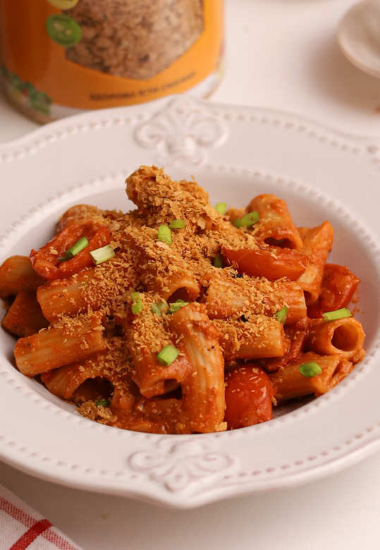 Ця паста — приклад того, як проста страва може перетворитися на витончену завдяки невеликому секретному інгредієнту. Flakes із морквою додають легкий овочевий відтінок, що чудово поєднується з томатами.