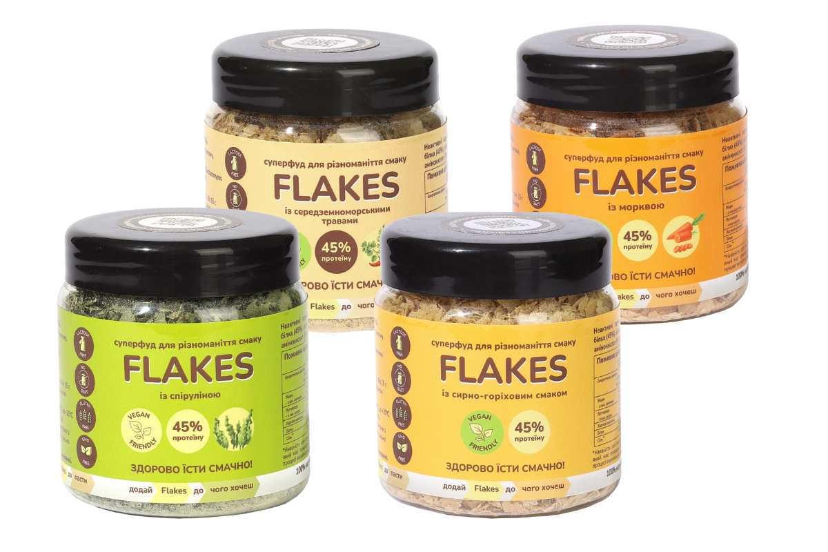 У наборі 4 смаки Flakes по 50 г: сирно-горіхові, з морквою, зі спіруліною та з середземноморськими травами. Всі вони зберігають головну перевагу Flakes – 45% повноцінного білка та 21% клітковини.